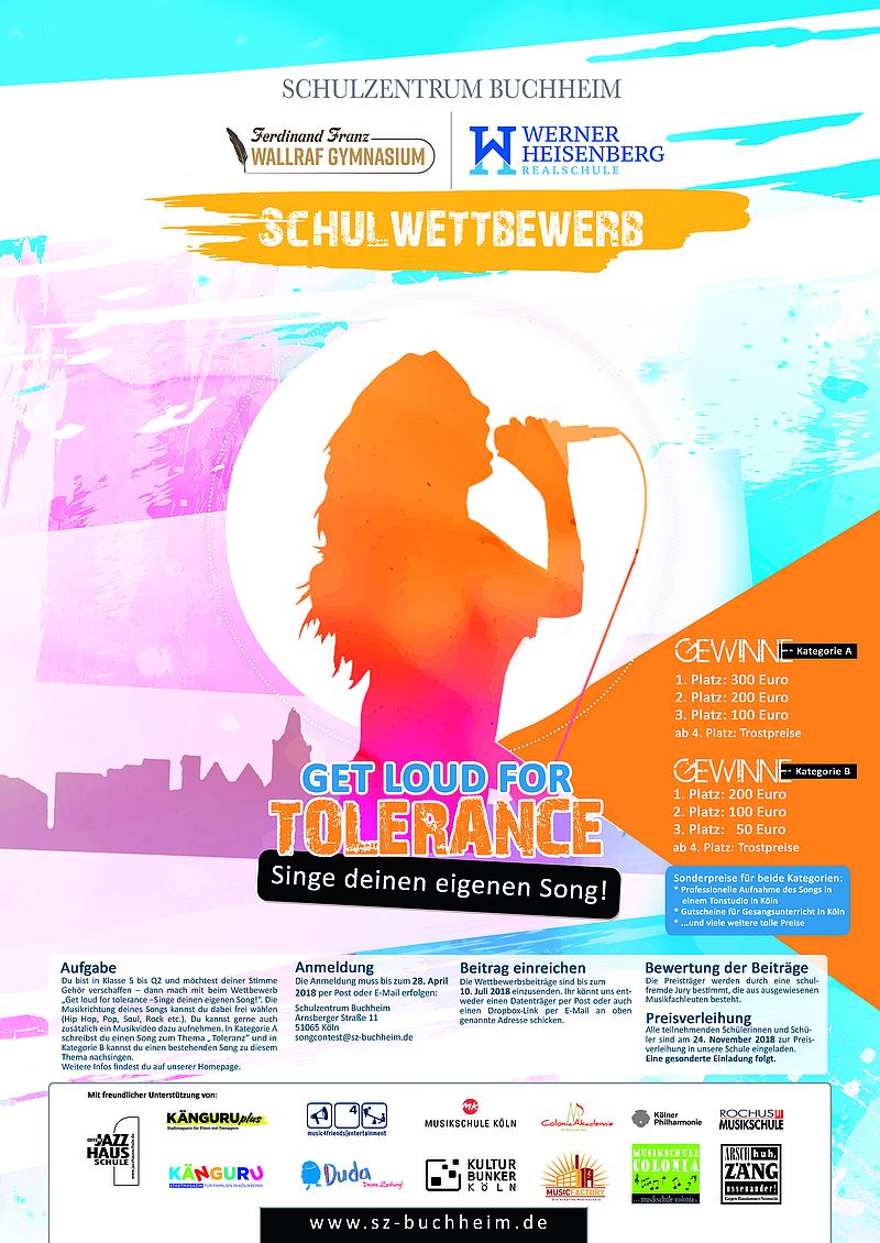 Bei dem Musikwettbewerb „Get loud for tolerance“, den das Schulzentrum Buchheim im November 2018 veranstaltet hat, handelte es sich um einen NRW-weiten Wettbewerb für Schülerinnen und Schüler der 5. Klasse bis zur Q2, die sich mit dem Thema „Toleranz“ auseinandersetzten, indem sie ihren eigenen Song geschrieben und gesungen haben. Bei der feierlichen Preisverleihung, zu der rund 300 Gäste kamen, wurden die Gewinner gekürt und ihre Beiträge dem Publikum präsentiert. Ausgewählt wurden die Gewinner von einer schulfremden Jury, bestehend aus vier Musikfachleuten. In dem Gewinnersong ging es neben Toleranz um die gegenseitige Akzeptanz anderer Kulturen, Religionen und Gesinnungen, aber auch um den Appell für ein vorurteilsfreies und lebendiges Miteinander in einer bunten Gesellschaft. Zielsetzung des Projektes war es, Kindern und Jugendlichen den Raum zu bieten, sich Gehör zu verschaffen und frei ihre Gedanken zum Ausdruck zu bringen, um sich für eine Welt ohne Fremdenhass und Rassismus stark zu machen.