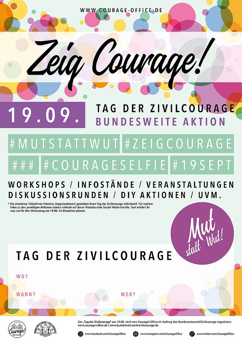 Mut & Courage Bad Aibling wurde 2010 gegründet. Ursprünglich ging es um die Frage: Warum reagieren Menschen in brenzligen Situationen und warum andere nicht? Herausgefunden haben die Ehrenamtlichen des Vereins, dass Zivilcourage auf einer Haltung dem Leben, Anderen und sich selbst gegenüber basiert. In der lauten, hektischen und schnellen Zeit ist die innere Stimme zu leise geworden. Zivilcourage basiert auf der inneren natürlichen Werteskala. Wir, als Gesellschaft, achten zu sehr auf die Biografien von Tätern und vergessen die Opfer dabei. Diese sind, die Mutigen und Starken, wenn sie nach Erlebtem wieder in das Leben zurückfinden. Dem Verein ist es wichtig die Begriffe Mut, Courage, Respekt und Zivilcourage immer wieder mit kreativen Mitteln in das Bewusstsein zu rücken. Demokratie kann durch respektvollen Umgang, Dialog und Engagement mit Leben erfüllt werden. Manchmal gehört auch dazu, notwendige Kompromisse einzugehen, diese zu leben und zu vertreten.