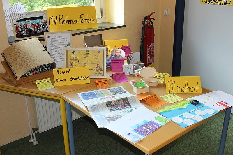 Die Schüler/innen der Klasse 2a erstellten in Kooperation mit einer Sonderpädagogin des überregionalen Förderzentrums Sehen in Neukloster ein Märchenbuch für sehbeeinträchtigte Kinder. Dieses Projekt entstand durch eigenes Interesse der Kinder. In der Klasse lernt ein seheingeschränkter Junge. Seine Mitschüler/innen wollten wissen, wie er die Welt erlebt und wahrnimmt. Die Lernenden gestalteten daher ihr eigenes Märchen als sehbeeinträchtigten gerechtes Buch. Die Klasse war stolz auf ihr Werk und wollte noch mehr: das Buch weiterreichen, sodass vor allem Kinder mit Beeinträchtigungen eine Unterstützung im Lesen haben. Sehr naheliegend war somit das indirekte Engagement durch eine Kooperation mit der Sonderpädagogin des überregionalen Förderzentrums Sehen. Sie bekam das Buch und las es mit ihren Schüler/innen. Die Lesefreude wurde durch das Buch bestärkt. Die Schüler/innen der 3a interessierten sich weiterhin für den Alltag mit Sehbeeinträchtigungen. So entschlossen sie sich dazu, ihre Mitmenschen aufklären zu wollen. Die Kinder informierten sich zu Seheinschränkungen und Blindheit, planten und schrieben Texte. Sie sammelten auch Anschauungsmaterial. All dies und das Märchenbuch wurden Teil der Ausstellung in der Warener Stadtbibliothek (siehe D2). Dadurch weiteten sich unsere Projekt- und Engagementziele aus. Sie möchten auch die Toleranz und das Verständnis für Beeinträchtigungen in der Gesellschaft stärken. Dies ist nicht nur für die erwachsene Gesellschaft wichtig, erkannten sie. Um Kitakindern in der Vorbereitung auf die Schule zu stärken, lasen Sie ihnen ihr Blindenbuch vor und erzählten ihnen von Sehbeeinträchtigten.